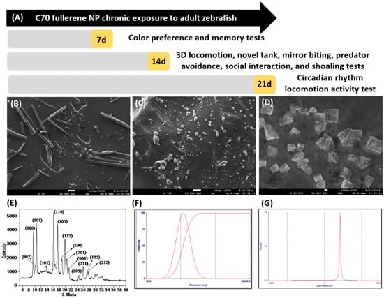 (A) Overview of the experimental design and time points for chronic exposure of C70 fullerene nanoparticles (NPs) to adult zebrafish. For chronic toxicity, we measured color preference and short-term memory at 7 days post-exposure (dpe). 3D locomotion, novel tank, mirror biting, predator avoidance, social interaction, and shoaling tests were given at 14 dpe. The circadian rhythm test was given at 21 dpe. After all behavior tests, fish were dissected and subjected to biochemical assays by 22 dpe. Characterization of the C70 NPs used in this study: (B) SEM micrograph of C70 NPs stock solution in the absence of solvents, (C) C70 NPs dissolved in DMSO showing wide disparity in aggregation, (D) high magnification scanning electron micrograph showing the size of C70 NPs used in this study, and (E) X-ray diffraction patterns of the crystal quality of the C70 NPs. (F) The particle size distribution of 0.5 ppm C70 NPs in DMSO was measured by dynamic light scattering. C70 NP suspensions were sonicated prior to measurement to resuspend the large particles and assess changes in large aggregate status. (G) The zeta potential value of C70 NPs is estimated at −34.0 mV.