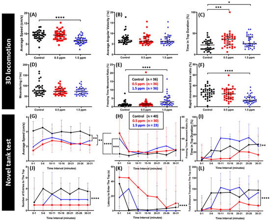 Comparison of behavior endpoints between the untreated control and C70 NP-exposed zebrafish in 3D locomotion and novel tank tests after 14-day exposure. (A) Average speed, (B) average angular velocity, (C) time in top duration, (D) meandering, (E) freezing time movement ratio, and (F) rapid movement time ratio were analyzed for the 3D locomotion test. For the novel tank test, (G) average speed, (H) freezing time movement ratio, (I) time in top duration, (J) number of entries to the top, (K) latency to enter the top, and (L) total distance traveled in the top were analyzed. The data are expressed as the median with interquartile range. The 3D locomotion test data were analyzed by the Kruskal–Wallis test, with Dunn’s multiple comparisons test as a follow-up test (n = 36 for both control and treatment groups). The novel tank test data were analyzed by two-way ANOVA with Geisser–Greenhouse correction (n = 40 for the untreated control; n = 30 for the 0.5 ppm C70 NP-exposed fish; n = 23 for the 1.5 ppm C70 NPs-exposed fish; * p < 0.05, ** p < 0.01, *** p < 0.001, **** p < 0.0001).