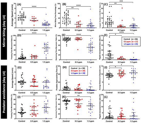 Comparison of mirror biting and predator avoidance behavior endpoints between the untreated control and C70-exposed fish after 14-day exposure. (A) Average speed, (B) mirror biting time percentage, (C) longest duration in the mirror side, (D) freezing time movement ratio, (E) swimming time movement ratio, and (F) rapid movement time ratio were analyzed for the mirror biting assay (n = 30 for the untreated control; n = 12 for the 0.5 ppm C70 NP-exposed fish; n = 23 for the 1.5 ppm C70 NP-exposed fish). For predator avoidance test, the (G) average speed, (H) predator approaching time ratio, (I) average distance to separator, (J) freezing time movement ratio, (K) swimming time movement ratio, and (L) rapid movement time ratio were analyzed (n = 30 for the untreated control; n = 23 for the 0.5 ppm C70 NP-exposed fish; n = 19 for the 1.5 ppm C70 NP-exposed fish). The data are expressed as the median with interquartile range and were analyzed by the Kruskal–Wallis test continued with Dunn’s multiple comparisons test as a follow-up test (* p < 0.05, ** p < 0.01, *** p < 0.001, **** p < 0.0001).