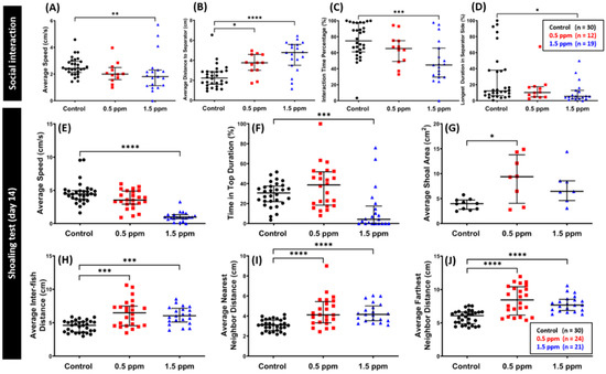 Comparison of social interaction and shoaling behavior endpoints between the untreated control and C70 NP-exposed fish after 14-day exposure. (A) Average speed, (B) average distance to separator side, (C) interaction time percentage, and (D) the longest duration in the separator side were analyzed for the social interaction test (n = 30 for the untreated control; n = 12 for the 0.5 ppm C70 NP-exposed fish; n = 19 for the 1.5 ppm C70 NP-exposed fish). For the shoaling test: (E) average speed, (F) time in top duration, (G) average shoal area, (H) average inter-fish distance, (I) average nearest neighbor distance, and (J) average farthest neighbor distance were analyzed (n = 30 for the untreated control; n = 24 for the 0.5 ppm C70 NPs-exposed fish; n = 21 for the 1.5 ppm C70 NPs-exposed fish, with 3 fish for each shoal). The data are expressed as the median with interquartile range and were analyzed by the Kruskal–Wallis test, with Dunn’s multiple comparisons test as a follow-up test (* p < 0.05, ** p < 0.01, *** p < 0.001, **** p < 0.0001).