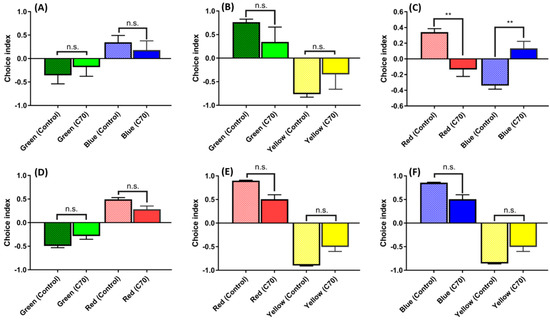 Comparison of color preferences between the untreated control and 1.5 ppm of C70 NP-exposed fish: (A) green vs. blue combination; (B) green vs. yellow combination; (C) red vs. blue combination; (D) green vs. red combination; (E) red vs. yellow combination; and (F) blue vs. yellow combination. Since all of the data were not normally distributed, they were analyzed using non-parametric Kruskal–Wallis followed by Dunn’s post-hoc test, and p < 0.05 was considered significantly different. The data are presented with mean ± SEM with n = 24, n.s. = not significant, ** p < 0.01.