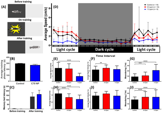 The short-term memory and circadian rhythm assay for the untreated control and C70 NP-exposed fish after 7- and 21-day exposure, respectively. (A) Schematic showing the experimental protocol for the passive avoidance test. (B) The average training phase latency on zebrafish learning. (C) The memory retention latency for the memory test. The data are expressed as the mean ± SEM and were analyzed by two-way ANOVA with Sidak’s multiple comparisons test as a follow-up test (n = 10 for the untreated control; n = 6 for the C70 NP-exposed fish). (D) Comparison of time chronological changes of the average speed between wild-type and C70 NP-exposed fish in the day and night cycle. The grey area shows the dark period and the unshaded area is the light period. Comparison of (E) average speed, (F) average angular velocity, and (G) meandering at light period. Comparison of (H) average speed, (I) average angular velocity and (J) meandering at the dark period. The data are expressed as the median with interquartile range and were analyzed by Kruskal–Wallis test, with Dunn’s multiple comparisons test as a follow-up test (n = 18 for the untreated control; n = 18 for 0.5 ppm C70 NP-exposed fish; n = 9 for the 1.5 ppm C70 NP-exposed fish; *** p < 0.001, **** p < 0.0001).