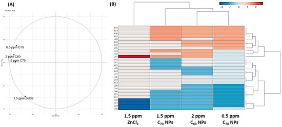 Comparison of behavioral alterations in zebrafish after exposing to either C60 NPs, C70 NPs or ZnCl2. (A) Results obtained from principal component analysis (PCA). (B) Results obtained from hierarchical clustering and heat map analysis.
