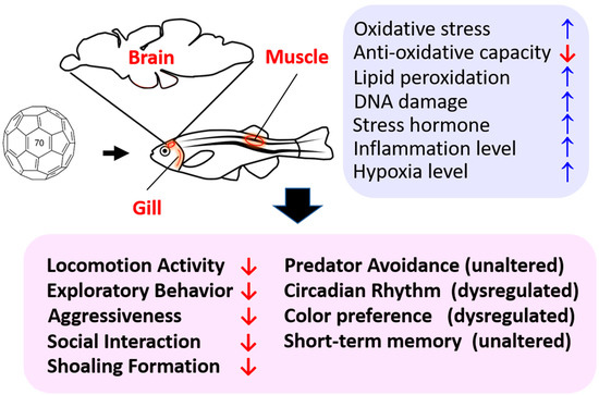 To our knowledge, this is the first study to show behavioral alterations induced by fullerene C70 NPs chronic exposure in adult zebrafish at environmentally-relevant concentrations. These effects seem to be correlated with changes in oxidative stress, inflammation, hypoxia, and imbalance of neurotransmitters in the brain (summarized in Figure 8). By utilizing this multiple behavioral test approach, our dynamic whole-animal model can be used to reveal the toxic potential of novel manufactured nanomaterials at the behavioral, physiological, and cellular levels. Furthermore, information obtained using this animal model system could be used as rapid feedback for engineers manufacturing novel nanomaterials, such that they can consider potential toxicity to favor the development of engineered nanoparticles with minimal toxicity.