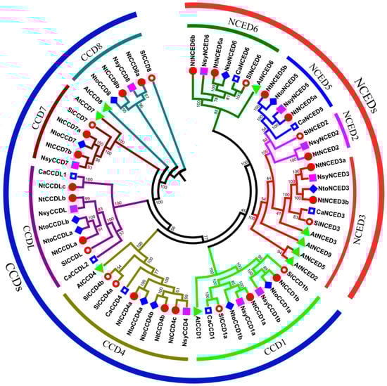 Phylogenetic analysis of CCD proteins from six species. Clustalx 6.0 was used to align the multiple sequences. Phylip3.69 was used to build the unrooted neighbor-joining (NJ) tree with 1000 bootstrap replicates. The CCD proteins of Nicotiana tabacum, Nicotiana sylvestris, Nicotiana tomentosiformis, Arabidopsis thaliana, Solanum lycopersicum, and Capsicum annuum were marked by red circle, pink square, light blue diamond, green triangle, red hollow circle, and blue hollow square, respectively. The protein/gene IDs in Nicotiana tabacum, Nicotiana sylvestris, and Nicotiana tomentosiformis are listed in Table 1, and the other three species, Arabidopsis thaliana, Solanum lycopersicum, and Capsicum annuum, are in Supplementary Table S1, respectively.