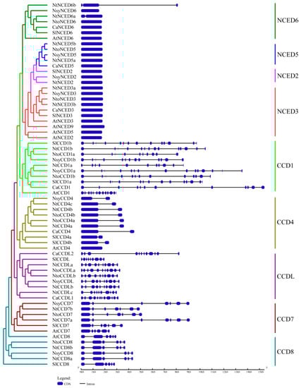 Schematic diagram of exon/intron structures of CCD genes from Nicotiana tabacum, Nicotiana sylvestris, Nicotiana tomentosiformis, Arabidopsis thaliana, Solanum lycopersicum, and Capsicum annuum. The unrooted neighbor-joining (NJ) evolutionary tree (left panel) was constructed by using Phylip3.69, with 1000 bootstrap replicates. The protein/gene IDs in Nicotiana tabacum, Nicotiana sylvestris, and Nicotiana tomentosiformis are listed in Table 1, and the other three species, Arabidopsis thaliana, Solanum lycopersicum, and Capsicum annuum, are in Supplementary Table S1, respectively. Exon–intron analyses of CCD genes were performed with GSDS 2.0 (right panel). Blue boxes and black lines correspond to exons (CDS) and introns, respectively.