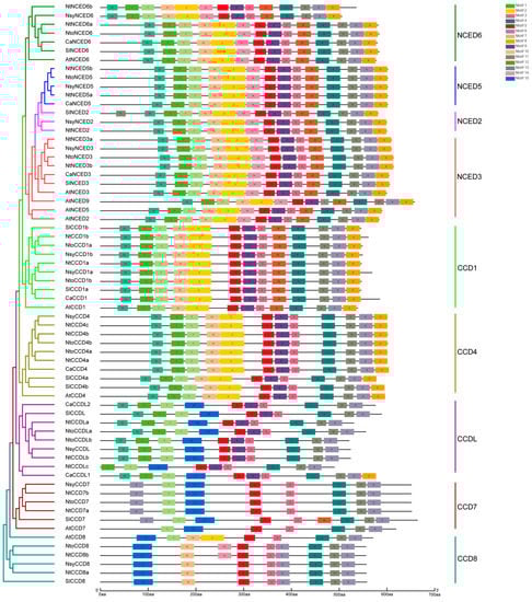 The conserved motifs of CCD proteins from Nicotiana tabacum, Nicotiana sylvestris, Nicotiana tomentosiformis, Arabidopsis thaliana, Solanum lycopersicum, and Capsicum annuum. In the left panel, the unrooted neighbor-joining (NJ) evolutionary tree was constructed by using Phylip3.69, with 1000 bootstrap replicates. The protein/gene IDs in Nicotiana tabacum, Nicotiana sylvestris, and Nicotiana tomentosiformis are listed in Table 1, and the other three species, Arabidopsis thaliana, Solanum lycopersicum, and Capsicum annuum are in Supplementary Table S1, respectively. In the right panel, different-color boxes represent different motifs.