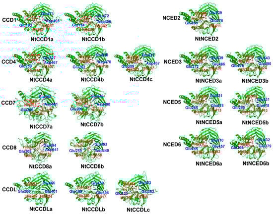 The predicted 3D structures of NtCCDs family proteins. The models were built with SWISS-MODEL and displayed with PyMOL software. The conserved four iron-ligating histidine (H) residues, and the conserved glutamates or aspartates (glycine in CCDL group) required for activity were marked with red and blue sticks and characters.