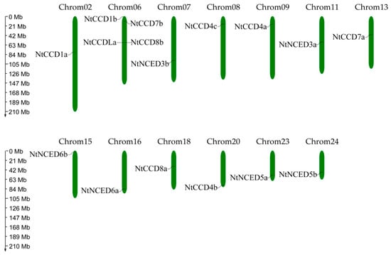 We further determined the localizations of the CCD gene family on chromosomes of N. tabacum. Information from physical maps (including the numbers, lengths, and gene loci) of each N. tabacum chromosome was obtained from the China Tobacco Genome Database (V2.0). In general, 19 NtCCDs genes were unevenly distributed throughout 13 chromosomes and three genes were anchored to unattributed scaffolds (Figure 5, Table 1). No NtCCDs genes were mapped to the other 11 tobacco chromosomes. Four NtCCDs genes (NtCCD1b, NtCCD7b, NtCCD8b, and NtCCDLa) were located on chromosome 6, and 12 other chromosomes (2, 7, 8, 9, 11, 13, 15, 16, 18, 20, 23, 24) harbored only a single NtCCD gene each. In addition, due to a lack of physical map information for N. sylvestris and N. tomentosiformis, NsyCCDs and NtoCCDs could only be located on the scaffolds but not on the chromosomes of these species.