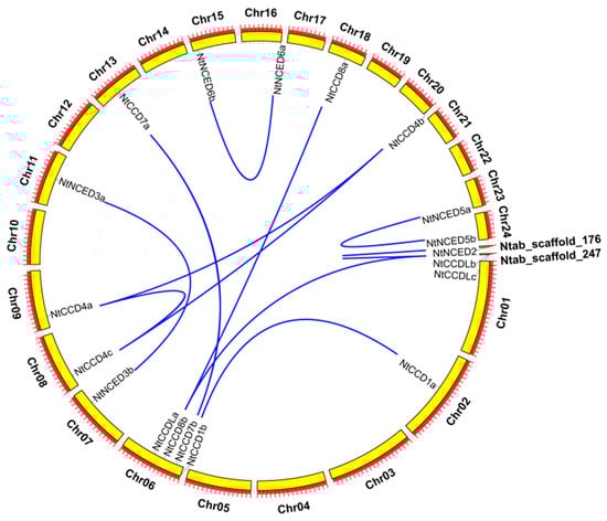 Gene duplications of the NtCCDs genes in Nicotiana tabacum. The relationships between CCD homologs were verified and visualized by using the Circos tool in TBtools software.