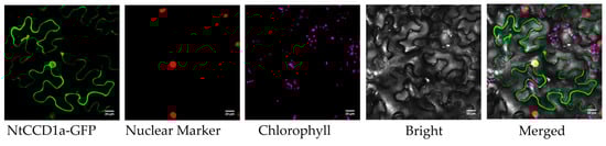 Using the transient expression methods induced by the Agrobacterium-mediated transformation, the cellular distributions of NtCCD1a proteins labeled by green fluorescent protein (GFP) were further investigated in tobacco leaves epidermal cells. In the leaves of the transformed control vector plant, the fluorescence of the GFP was detected in the cytoplasm and nucleus. After transient expression of NtCCD1a-GFP fusion proteins in tobacco leaves, the GFP signals were also merged with the nuclear localization signals (NLS) of the nucleus-anchored marker (Figure 7), suggesting that NtCCD1a was localized to both the cytoplasm and nucleus.