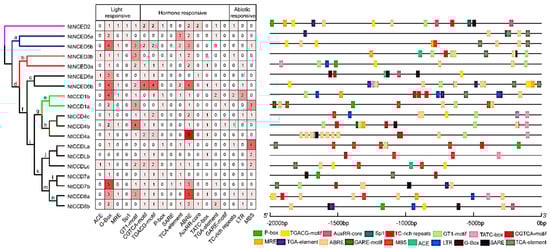 Promoter cis-elements analysis of NtCCDs. Left panel, the unrooted neighbor-joining (NJ) evolutionary tree. Middle panel, the number of cis-elements in CCD promoter. Right panel, the schematic distribution of cis-elements. Some cis-elements may overlap with others. Different cis-acting elements were displayed with different-color boxes. a–n: the foreground branch labeled in the molecular evolution analysis followed.