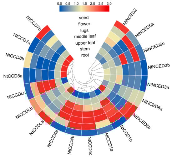 To elucidate the roles of NtCCD genes, the tissue-specific expression levels of CCD genes were analyzed, using the qRT-PCR method. Seven samples including root, stem, upper leaf, middle leaf, lugs, flower, and seeds were collected. The results showed that most NtCCD genes were expressed in the upper leaf, middle leaf, and lugs. Five genes (NtCCD1b, NtCCD4b, NtCCD4c, NtNCED5a, and NtNCED5b) were highly expressed in the flower (Figure 9, Supplementary Table S3). Six genes (NtCCD1a, NtCCD1b, NtCCD4a, NtCCD4b, NtCCD4c, and NtCCDLc) were highly expressed in middle leaves and lugs, followed by the upper leaves and flower. Six genes (NtCCD7a, NtCCD7b, NtCCD8a, NtCCD8b, NtNCED3a, and NtNCED3b) showed the highest expression in roots. In contrast, four genes (NtCCD7b, NtCCDLa, NtNCED2, and NtNCED6b) were highly expressed in the seed. These diverse expression levels could suggest that CCD family genes have functional importance in different tissues.
