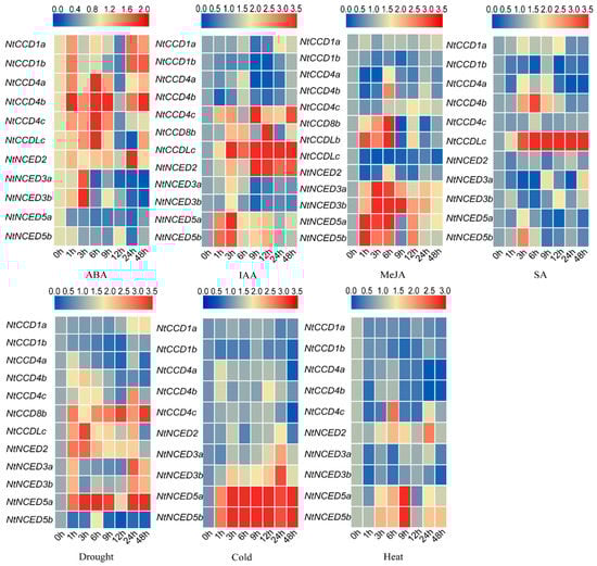 To investigate the effects of plant hormones and abiotic stresses on NtCCDs genes, the expression patterns of NtCCDs induced by the four hormones (ABA, MeJA, IAA, SA) associated with plant abiotic stresses (drought, cold, heat) were analyzed by qRT-PCR (Figure 10, Supplementary Table S4a–g). Of note, we did not detect the expression of NtCCD7a, NtCCD7b, NtCCD8a, NtCCDLa, NtNCED6a, and NtNCED6b in response to these treatments. In ABA-treated samples, the expression of most genes exhibited two peaks, showing an increasing pattern after ABA treatment and plateauing at 3–9 h, subsequently decreasing following the next peak. However, NtNCED5a and NtNCED5b exhibited decreased expression levels. The expression of other genes was not obviously changed. With respect to IAA treatment, the expression of NtCCD4c, NtCCD8b, NtCCDLc, NtNCED2, NtNCED5a, and NtNCED5b was obviously induced but reached their highest levels at different points. The expression of six genes (NtCCD8b, NtCCDLb, NtNCED3a, NtNCED3b, NtNCED5a, and NtNCED5b) was significantly increased after MeJA treatment, whereas expression of the remaining genes changed only slightly. Moreover, only the expression of NtCCD4c and NtCCDLc was induced remarkably by SA treatment. Regarding abiotic stresses, drought could evidently induce the highest increase in the expression of NtCCD8b, NtCCDLc, NtNCED3a, NtNCED3b, and NtNCED5a, followed by that of NtCCD4a, NtCCD4b, and NtCCD4c, and most genes showed a bimodal trend. The expression of NtNCED5a and NtNCED5b was significantly induced by cold treatment and reached a peak level at 9 h. NtNCED3a and NtNCED3b were also affected, especially at 24 h. Finally, for high-temperature stress, most genes were downregulated; however, the expression of NtCCD4c, NtNCED2, NtNCED5a, and NtNCED5b was significantly upregulated, particularly at 6 or 9 h after treatment.