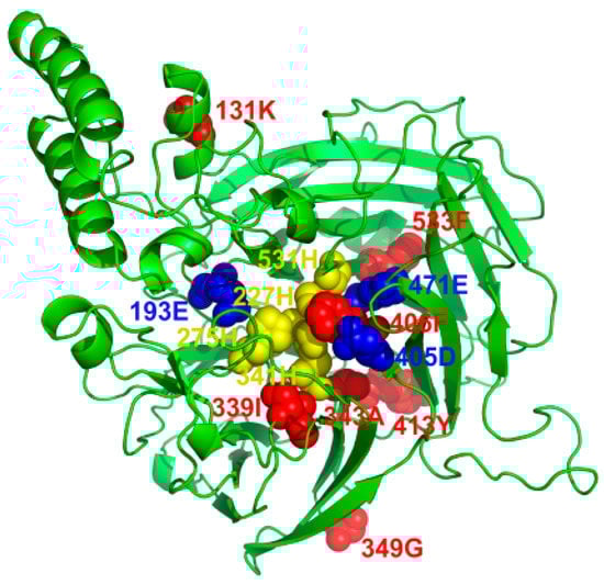 The predicted 3D structures and the positive sites of NtCCD1a (used as amino acid reference). The models were built with SWISS-MODEL and displayed with PyMOL software. The conserved four iron-ligating histidine (H) residues, and the conserved glutamates or aspartates (glycine in CCDL group) required for activity and positive sites were marked with yellow, blue, and red sphere, respectively.