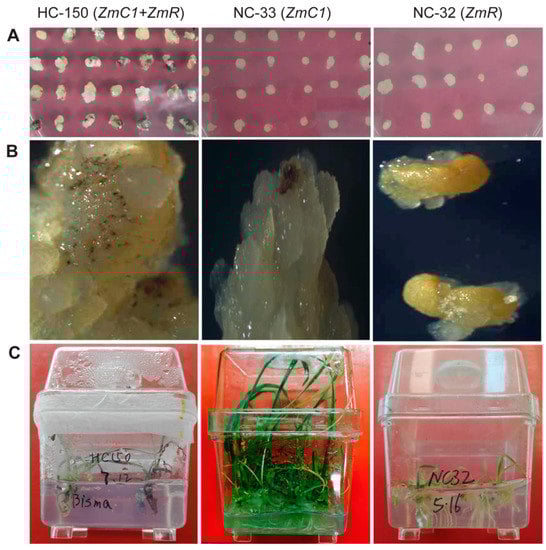 Anthocyanin phenotype in the transformed immature embryos (A), embryonic calluses (B), and regenerated plantlets (C) of wheat using different expression vectors. Experiment HC-150 was set up for the co-transformation of expression vector pWMB202 (carrying ZmC1 and ZmR) and pWMB111 (carrying Bar only). NC-33 and NC-32 were set up for the transformation of expression vectors pWMB196 (carrying ZmC1 only) and pWMB198 (carrying ZmR only), respectively. Plantlet age: about 60 days after regeneration culture accompanying phosphinothricin (PPT) selection.