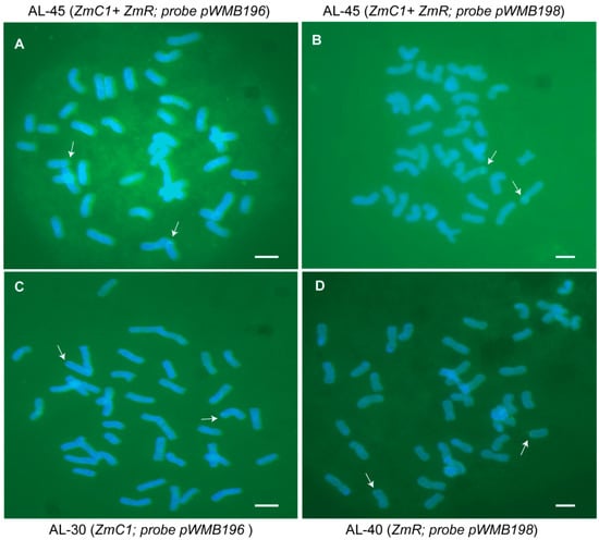 Wheat seeds were germinated on porous paper at room temperature, and their rapidly growing roots were collected. The root tips were treated with nitrous oxide (NO) for 2 h and then fixed with 90% glacial acetic acid for 5 min. The chromosome preparation was accomplished using a previously established method [56]. Fluorescence in situ hybridization (FISH) was performed to produce the stable transgenic wheat lines AL-30 (ZmC1), AL-40 (ZmR), and AL-45 (ZmC1 + ZmR) lines in the T3 generation using vectors pWMB196 containing ZmC1 and pWMB198 containing ZmR as probes, which were labelled with fluorescein−12-dUTP. Hybridization procedures were performed, and the prepared slides were visualized using an Olympus BX-51 microscope with a Photometric SenSys Olympus DP70 CCD camera [56].