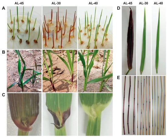 Anthocyanin phenotype in the various vegetative tissues of the three types of stable transgenic wheat lines. Transgenic line AL-45 containing ZmC1 and ZmR was derived from the co-transformation with vectors pWMB202 and pWMB111. Transgenic lines AL-30 containing ZmC1 only and AL-40 containing ZmR only were derived from the transformation with vectors pWMB196 and pWMB198, respectively. (A) coleoptiles, (B) seedlings, (C) auricles, (D) leaves, and (E) stems.