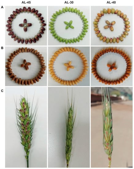 Anthocyanin accumulation in the reproductive tissues of the three types of stable transgenic wheat lines. Transgenic line AL-45 containing ZmC1 and ZmR was derived from the co-transformation with vectors pWMB202 and pWMB111. Transgenic lines AL-30 containing ZmC1 only and AL-40 containing ZmR only were derived from the transformation with vectors pWMB196 and pWMB198, respectively. (A) Immature seeds. (B) Dried seeds. (C) Spikes.