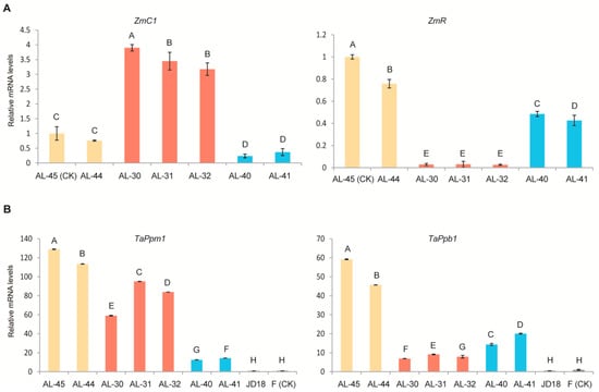 Expression analysis of maize ZmC1 and ZmR genes (A), and their corresponding wheat homologous genes TaPpm1 and TaPpb1 (B) in the three types of stable transgenic wheat lines by quantitative real-time PCR (qRT-PCR). Transcript levels in the leaves of the three types of transgenic lines of AL-45 and AL-44 containing ZmC1 and ZmR (yellow columns), AL-30, AL-31, and AL-32 containing ZmC1 only (red columns), and AL-40 and AL-41 containing ZmR only (blue columns). Wild type plants of Fielder (F) and Jingdong18 (JD18) (black columns) were determined in three biological replicates. CK stands for the material used as a reference to calculate the relative expression level. Vertical bars are mean ± SD. Different letters in columns indicate statistically significant differences (p < 0.05).