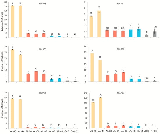 Expression analysis of six wheat native structural genes (TaCHS, TaCHI, TaF3H, TaF3′H, TaDFR, and TaANS) involved in the anthocyanin biosynthesis pathway in the leaves of the three types of stable transgenic wheat lines by quantitative real-time PCR (qRT-PCR). Transcript levels in the leaves of the three types of transgenic lines AL-45 and AL-44 containing ZmC1 and ZmR (yellow columns), AL-30, AL-31, and AL-32 containing ZmC1 only (red columns), AL-40 and AL-41 containing ZmR only (blue columns), as well as the two wild types Fielder (F) and Jingdong18 (JD18) (black columns) were determined in three biological replicates. CK stands for the material used as a reference to calculate the relative expression level. Vertical bars are mean ± SD. Different letters in columns indicate statistically significant differences (p < 0.05).