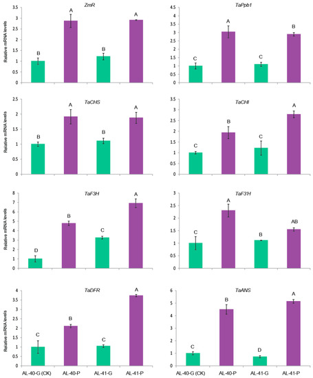 Expression profiles of maize ZmR, its wheat homologue TaPpb1, and six structural genes (TaCHS, TaCHI, TaF3H, TaF3′H, TaDFR, and TaANS) involved in anthocyanin biosynthesis in the light exposed seeds (AL-40-P and AL-41-P in purple color columns) and control seeds (AL-40-G and AL-41-G in green color columns) in the same spike in the two ZmR containing stable transgenic lines AL-40 and AL-41. CK stands for the sample used as a reference to calculate the relative expression level. Vertical bars are mean ± SD. Different letters in columns indicate statistically significant differences (p < 0.05).
