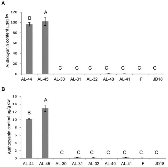 According to previous studies, several derivatives account for the total anthocyanin contents in cereals, with cyanidin 3-O-glucoside as the main derivative found in cereal grains [51,52]. Quantitative analysis of anthocyanin contents in the proposed study also indicated that cyanidin 3-O-glucoside is the major anthocyanin form present in the leaf and seed tissues of the transgenic wheat plants containing maize ZmC and/or ZmR genes. Transgenic lines AL-44 and AL-45 had the highest anthocyanin contents in their leaves and seeds as expected (Figure 10). Our results confirmed that simultaneous overexpression of both maize genes in wheat produced high anthocyanin pigmentation due to the MBW complex formation.