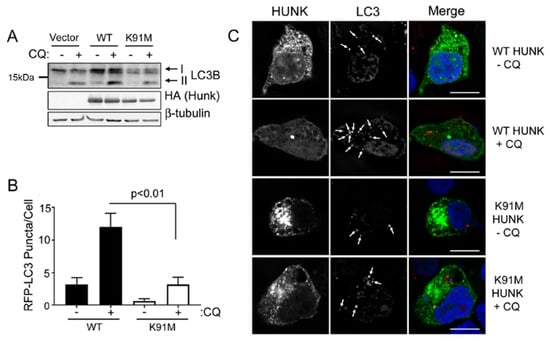 Prior studies from our lab showed that HUNK promotes autophagy, but it is unknown if this function is dependent on HUNK’s enzymatic activity [,]. To address this question, we evaluated cells expressing an empty vector, wildtype (WT) HUNK or a kinase inactive (K91M) mutant of HUNK by immunoblotting for endogenous LC3B protein to assess LC3BII protein accumulation. WT HUNK-expressing cells showed an increase in LC3BII after 4 h of serum deprivation in the presence of the late-stage autophagy inhibitor chloroquine (CQ), compared to empty vector and K91M HUNK-expressing cells (Figure 1A). We also observed that levels of p62 were suppressed when WT HUNK was expressed in the absence of CQ but that empty vector and K91M HUNK-expressing cells had elevated levels of p62, regardless of CQ treatment (Supplementary Figure S1). Additionally, we evaluated LC3B puncta formation in cells expressing either WT HUNK, or K91M HUNK. 293T cells were transfected with RFP-LC3 and GFP-WT HUNK or GFP-K91M HUNK. Cells were serum deprived for 4 h, treated with CQ, and imaged by confocal microscopy to detect LC3B puncta, indicating the presence of autophagosomes. In basal and CQ-treated conditions, cells expressing WT HUNK had higher levels of LC3B-positive (LC3+) puncta than cells expressing K91M HUNK (Figure 1B,C). Altogether, these data suggest that HUNK kinase activity is required for HUNK-mediated autophagy.