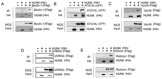 Because the Beclin-1 complex is essential for autophagosome formation and maturation, we investigated whether HUNK binds to this complex. HUNK and Beclin-1 complex members were transfected into 293T cells and analyzed for protein–protein interactions via co-immunoprecipitation. Each complex member was transfected individually in conjunction with HUNK. HUNK co-immunoprecipitated with Beclin-1 (Figure 2A), Atg14 (Figure 2B), Vps34 (Figure 2C), UVRAG (Figure 2D), and Rubicon (Figure 2E), suggesting that HUNK is able to bind the Beclin-1 complex.