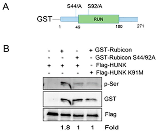 The recombinant form of Rubicon protein that we used in Figure 3A only included amino acids 1-375 (aa 1-375), demonstrating that HUNK phosphorylated the N-terminus of Rubicon, although not ruling out additional sites of phosphorylation C-terminal to aa 375. The N-terminus of Rubicon contains a unique region called the RUN domain, a protein binding domain typically found in Rab proteins. The RUN domain of Rubicon was previously shown to be required for Rubicon’s capacity to suppress autophagy []. There are only two serine residues that lie either within the RUN domain (i.e., serine (S) 92) or within 10 amino acids of the RUN domain (i.e., S44). Therefore, we constructed a GST-tagged truncated version of WT or S44 and S92 mutated to alanine (A) Rubicon containing amino acids 1-271 (Figure 4A) and isolated recombinant protein to use as substrate for a HUNK kinase assay. Flag-WT HUNK and Flag-K91M HUNK were expressed in 293T cells and isolated for use in an in vitro kinase assay with GST-Rubicon and GST-S44/92A Rubicon as substrates. Kinase reactions were probed with anti-pSer antibody to assess GST-Rubicon phosphorylation by HUNK. Our results showed that HUNK phosphorylated GST-WT Rubicon, but that HUNK did not phosphorylate GST-S44/92A Rubicon (Figure 4B).