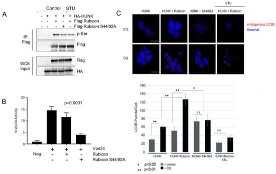 To assess autophagy, we expressed HUNK in conjunction with WT Rubicon or S44/92A Rubicon in 293T cells and monitored for endogenous LC3B puncta formation in the presence or absence of CQ treatment after 4 h of serum deprivation. We also used STU as a control to inhibit HUNK kinase activity. We found that co-expression of WT Rubicon and WT HUNK showed an increase in LC3B positive puncta under CQ-treated conditions compared to WT HUNK alone (Figure 5C). Co-expression of WT HUNK and Rubicon S44A/S92A did not show an increase in autophagy beyond the level seen with HUNK alone, regardless of CQ treatment (Figure 5C). Consistent with these observations, WT HUNK and Rubicon expressed in cells that were treated with STU showed reduced levels of autophagy (Figure 5C). Taken together, this set of data suggests that HUNK phosphorylates Rubicon in the N-terminus where the RUN domain region containing amino acids S44 and S92 is located and that the consequence of these phosphorylation events is to relieve the suppressive effect that Rubicon has on autophagy through regulation of Vps34 activity.