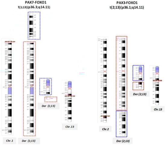 Approximately 80% of ARMS are cytogenetically characterized by chromosomal aberrations traslocating t(2;13)(q35;q14), respectively involving PAX3 gene at 2q35 to the FOXO1 gene at 13q14, generating a fusion transcript PAX3-FOXO1. Less frequently, the t(1;3)(q36;q14) translocation involves PAX7, on chromosome 1, and FOXO1, generating PAX7-FOXO1 fusion genes (Table 1; Figure 2) [,].