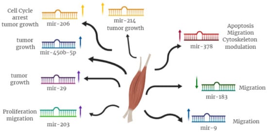 To this regard, several approaches that up-regulate or down-regulate miRNAs have been used to characterize and identify the miRNAs involved in the RMS, demonstrating significant efficacy in the treatment of the pathogenesis of RMS following intravenous administration in vivo []. In particular, two pre-clinical studies have shown that ectopic expression of miR-206 by lentiviral vectors leads to cell cycle arrest and myogenic differentiation of RMS cells, preventing cell growth in vivo, thanks to inhibition of oncogene expression c-MET [,]. Furthermore, experiments with miR-183 knockdown mice led to significant reductions in tumor migration through the direct promotion of EGR1 expression, regulator of cell migration []. Re-expression of miR-203 in RMS cells inhibits their proliferation and migration and promotes terminal myogenic differentiation by acting directly on p63 and leukemia inhibitory factor through JAK/STAT (Janus Kinases/Signal Transducer Activator of Transcription Protein) pathway modulation []. miR-29 re-expression in mouse model of RMS inhibited tumor growth through stimulation of differentiation mechanisms, suggesting a tumor-suppressor role for this miRNA []. Furthermore, in some studies, RMS growth and proliferation were significantly arrested by miR-450b-5p, strictly regulated by TGF-β1 []. Huang et al. demonstrated that overexpression of miR-214 was able to inhibit RMS tumor growth both in vitro and in vivo and induced myogenic differentiation by down-modulation of N-Ras [].
