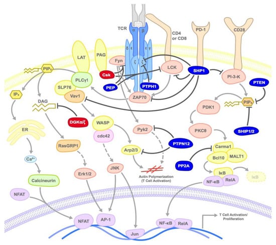 - Mustelin, T.; Tasken, K. Positive and negative regulation of T-cell activation through kinases and phosphatases. Biochem. J. 2003, 371, 15–27. [Google Scholar] [CrossRef]