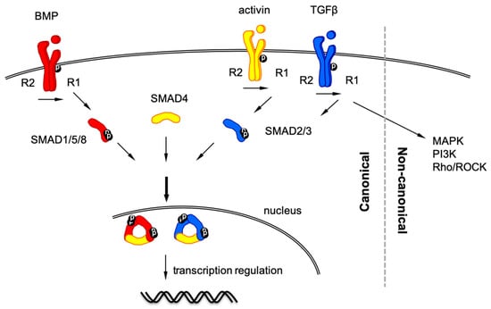 TGF-β superfamily signaling involves > 30 components, mainly divided into two subfamilies: the TGF-β-activin-nodal subfamily and the bone morphogenetic protein (BMP) subfamily [1,2,16] (Figure 1). TGF-β ligands assemble their corresponding receptors: two type 1 components and two type 2 components. Type 2 receptors serve as activators to phosphorylate type I receptors, whereas type 1 receptors function as propagators to transduce the signal downstream to cytoplasmic proteins. Components of both receptors are serine/threonine kinases. After ligand binding, BMP type 1 receptors phosphorylate SMAD1/5/8 (the abbreviation of SMAD refers to the homologies of SMA (small worm phenotype of Caenorhabditis elegans) and Drosophila MAD (Mothers Against Decapentaplegic), whereas TGF-β type I receptors and activin type 1 receptors phosphorylate SMAD2/3. These sets of SMAD proteins are known as receptor-regulated SMAD (R-SMAD). Phosphorylation of two C-terminal serine residues on R-SMAD facilitates trimerization with two R-SMAD molecules and one SMAD4 (also known as common-mediator SMAD, Co-SMAD). This SMAD trimer plays a central role in the TGF-β superfamily signaling to translocate to the nucleus and bind DNA via their DNA binding site. The CAGAC motif or its complementary sequence TCTG motif is referred to as the SMAD binding element (SBE) where SMAD2/3/4 mainly bind. In addition, SMAD1/5/8 and SMAD2/3/4 can also bind the GC-rich element when activated [4,17]. R-SMAD molecules in the SMAD4-R-SMAD complex can also bind other transcription factors as partners to regulate their transcription. In addition to the canonical SMAD-dependent pathway, TGF-β superfamily ligands transduce non-canonical, SMAD-independent pathways such as various mitogen-activated protein kinase (MAPK), phosphoinositide 3-kinase (PI3K)/Akt and Rho/Rho-associated protein kinase (ROCK) pathways [18].