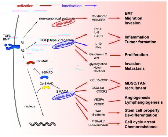 Non-canonical TGF-β signaling pathways also modulate important cellular physiology. Disruption of non-canonical TGF-β pathways as well as canonical ones is also frequently found in CRC. Although loss of SMAD4 may lead to the blockade of canonical TGF-β signaling, it alters BMP signaling via non-canonical pathway to promote CRC metastasis through activation of Rho/ROCK pathway, leading to EMT, migration, and invasion [81]. Loss of SMAD4 also activates alternative MEK/ERK pathways to promote cell mortality, migration, and invasion [82,83].