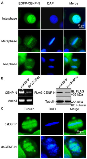 For subcellular localization analysis, cells were cultured on a cover slip, fixed with 3.7% formaldehyde in phosphate-buffered saline (PBS) for 10 min, and the nuclear DNA were stained by 4’,6-diamidino-2-phenylindole (DAPI) (Invitrogen, Carlsbad, CA, USA). For microtubule spindle analysis, BmN4-SID1 cells after RNAi of CENP-N or EGFP were incubated with an anti-tubulin monoclonal antibody (ab7291, Abcam, Cambridge, UK) to label the spindle microtubules, and the second antibody was FITC-labeled goat anti-mouse IgG (A0568, Beyotime, Shanghai, China) [52,53]. Fluorescent images were captured by using a Leica microscope (Z16, Leica, Wetzlar, Germany).
