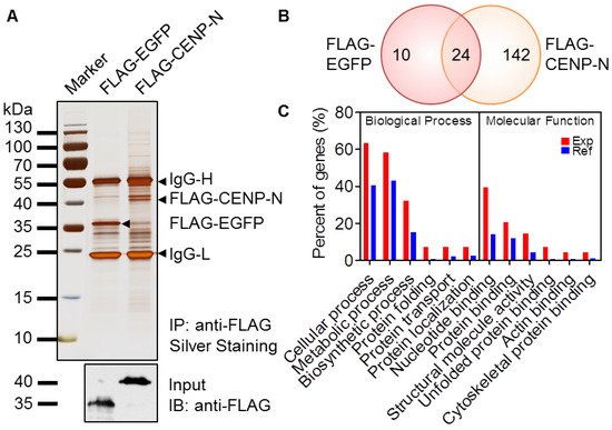 For the co-immunoprecipitation (Co-IP) assay, cells co-expressing the targeted proteins were harvested using IP lysis buffer (P0013, Beyotime, Shanghai, China) containing a mixture of protease inhibitors (Beyotime, Shanghai, China). The lysates were immunoprecipitated using an anti-HA antibody (AH158, Beyotime, Shanghai, China), and the eluted proteins were further detected by Western blotting using anti-FLAG (AF519, Beyotime, Shanghai, China) and anti-HA (AH158, Beyotime, Shanghai, China) antibodies [52]. For purification of the CENP-N complex, cells stably expressing FLAG-CENP-N were collected and lysed in RIPA buffer (50 mM, Tris-HCl (pH 7.5), 150 mM NaCl, 2 mM EDTA, 1% NP-40, and 0.25% sodium deoxycholate) with protease inhibitors. The cell supernatants were further incubated with anti-FLAG affinity gel beads (Sigma, Saint Louis, MO, USA) and purified according to the previous protocol [50]. Briefly, the affinity gel beads were washed with RIPA buffer five times, and then eluted by incubation with 200 μL elution buffer (50 mM Tris-HCl (pH 7.5), 50 mM DTT, 1 mM EDTA, 1% SDS, and 10% glycerol). The eluates were collected for Western blotting and liquid chromatography–tandem mass spectrometry (LC-MS/MS) assays.