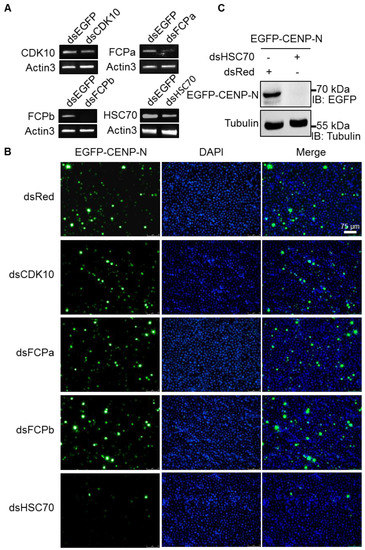 Reduced expression of CENP-N by heat shock cognate 70 (HSC70) depletion. (A) Knockdown efficiency of cyclin dependent kinase (CDK)10, FCPa, FCPb, and HSC70 was evaluated by RT-PCR. The expression of the actin3 gene was used as an internal control. (B) Effects of CDK10, FCPa, FCPb, and HSC70 knockdown on the expression of EGFP-CENP-N. EGFP-CENP-N stably expressing cells was knocked down by dsRNA for each gene. CENP-N was labeled with EGFP fluorescence (green) and the nuclear DNA were stained with DAPI (blue). Scale bar, 75 μm. (C) Knockdown of HSC70 decreased the expression of EGFP-CENP-N by using an anti-EGFP antibody. The expression of tubulin was used as an internal control. “+” and “-” represented the addition and non-addition of designated dsRNA, respectively.