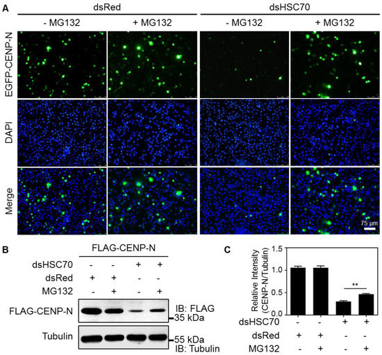 The stability of CENP-N may be largely dependent on the ubiquitylation of the protein itself. We next hypothesized that the HSC70 chaperone is involved in the protection of CENP-N degradation by the ubiquitin–proteasome proteolytic system. To test this hypothesis, we used the proteasome inhibitor MG132 to treat cells. As shown in Figure 4A, the HSC70 depleted cells without MG132 treatment greatly reduced the expression signals of EGFP-CENP-N, whereas the fluorescent signals were significantly restored in the presence of MG132. To confirm this observation, the cells stably expressing FLAG-CENP-N were also treated at the same way. Western blotting using an anti-FLAG antibody showed a similar result—in response to treatment with MG132, the expression of FLAG-CENP-N was enhanced in cells without HSC70 (Figure 4B,C). These data revealed that HSC70 functions as a chaperone for the stability of CENP-N so as to prohibit the proteasomal degradation of kinetochore proteins.