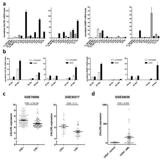 CALCRL expression is elevated at relapse of AML and in leukemic stem cells, and induced by araC. (a) Expression of CALCRL and RAMP1 in paired samples from diagnosis (Dx) and relapse (Rel) of AML was determined by qRT-PCR. Normalization to β-2-microglobulin and calibration to sample C1 was performed using the ΔΔCT method. C1–C4, healthy control samples 1–4; BM, bone marrow; MNC, mononuclear cells; P1–P11, patients 1–11. Means + SD from technical replicates. (b) Expression of CALCRL and RAMP1 in paired samples from diagnosis (Dx) and relapse (Rel), cultured in the presence or absence of araC for 2 days, was measured as in (a). (c) Expression of CALCRL in stem cell enriched (LSC+) versus stem cell depleted (LSC–) leukemic cell populations contained in data sets GSE76008 and GSE30377. (d) Expression of CALCRL in CD34+ cell populations from AML versus healthy donors, contained in data set GSE30029. (c,d) Data were used as provided in the respective data sets (log2 transformed or not). False discovery rate (FDR) was determined using the lmFit function of the R package Limma.