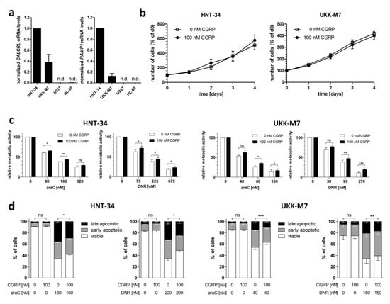 To investigate the effects of CGRP on human AML cells, the cell lines HNT-34 [] and UKK-M7, newly established from a patient with AML-M7 (see Methods for further details), were used. Both cell lines robustly express CALCRL and RAMP1, as determined by qRT-PCR (Figure 2a). Incubation with 100 nM CGRP for up to 4 days did not affect their proliferation in a suspension culture (Figure 2b). However, pre-treatment with CGRP significantly increased their metabolic activity (a proxy for viability) after exposure to various doses of araC or daunorubicin (Figure 2c). This indicated that CGRP-CALCRL signaling indeed increased resistance to the drugs used to treat AML, as hypothesized based on the expression data described above. These results were corroborated through the AnnexinV/DAPI assay: CGRP pre-treatment significantly increased the number of viable HNT-34 and UKK-M7 cells in the presence of araC or daunorubicin (Figure 2d, Figure S2).