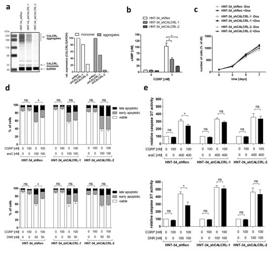 Genetic inhibition of CALCRL counteracts the CGRP-induced increase in chemotherapy resistance. CALCRL was knocked down in HNT-34 cells using lentivirus-borne, doxycycline inducible shRNAs. Unless indicated otherwise, experiments were performed after pre-incubation with and in the presence of doxycycline. (a) Expression of CALCRL in HNT-34_shRen, HNT-34_shCALCRL-1, and HNT-34_shCALCRL-2 was determined by capillary-based protein quantification analysis (Wes). Left panel, Wes plot; right panel, quantification. Protein aggregates are frequently observed with G-protein coupled receptors. (b) cAMP levels after stimulation of serum starved HNT-34_shRen, HNT-34_shCALCRL-1, and HNT-34_shCALCRL-2 with 0 or 1 nM CGRP for 2 min. Means + SEM from 3 biological replicates. * p < 0.05; paired Student’s two-tailed t-test. (c) Proliferation of HNT-34_shRen, HNT-34_shCALCRL-1, and HNT-34_shCALCRL-2 in the absence and presence of doxycycline. Means +/− SEM from 3 biological replicates (error bars do not exceed data point symbols in most cases). (d,e) CALCRL knock-down diminishes CGRP mediated protection from araC- and daunorubicin (DNR)-induced apoptosis. Cells were pre-incubated with or without 100 nM CGRP for 1 h prior to addition of the indicated concentrations of cytostatic drugs. Means +/− SEM from 3–4 biological replicates. ns, not significant, * p < 0.05, paired Student’s two-tailed t-test. (d) AnnexinV/DAPI assay. Significance indicators refer to the proportion of viable cells. (e) Caspase 3/7 assay.