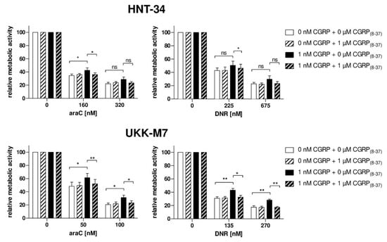 CGRP(8–37) counteracts the CGRP-induced increase in chemotherapy resistance. HNT-34 and UKK-M7 cells were pre-incubated first with or without 1 µM CGRP(8–37) for 15 min, next with or without 1 nM CGRP for 1 h, prior to addition of the indicated concentrations of araC or daunorubicin (DNR). CellTiter-Glo metabolic activity assay; means + SEM from 3 biological replicates. ns, not significant, * p < 0.05, ** p < 0.01, paired Student’s two-tailed t-test.