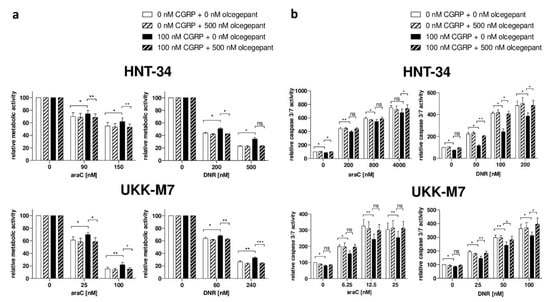 Olcegepant counteracts the CGRP-induced increase in chemotherapy resistance. HNT-34 and UKK-M7 cells were pre-incubated first with 500 nM olcegepant or an equivalent amount of solvent for 15 min, next with or without 100 nM CGRP for 1 h, prior to addition of the indicated concentrations of araC or daunorubicin (DNR). Means + SEM from 3–5 biological replicates. ns, not significant, * p < 0.05, ** p < 0.01, *** p < 0.001, paired Student’s two-tailed t-test. (a) CellTiter-Glo metabolic activity assay. (b) Caspase 3/7 assay.