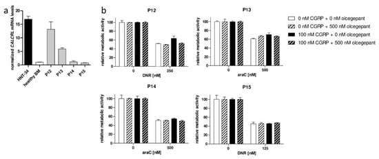 Concerning expression analyses, cells were prepared and, where indicated, treated with araC (4 µM for 48 h) as described previously [,]. Regarding metabolic activity assays, vitally frozen AML cells were thawed, washed with RPMI 1640 medium (Invitrogen, CA, USA) supplemented with 10% fetal bovine serum (FBS; Invitrogen), 1% Penicillin/Streptomycin/Glutamine (Invitrogen), and 5 µg/mL DNase (Sigma–Aldrich, Missouri, USA), and incubated for 60 min at 37 °C and 5% CO2 with RPMI 1640 medium containing 10% FBS, 1% Penicillin/Streptomycin/Glutamine, and 50 µg/mL DNase to prevent cell clumping. Cells were washed with PBS (Invitrogen) and cultured in RPMI 1640 medium containing 10% FBS, 1% Penicillin/Streptomycin/Glutamine, and 100 ng/mL each of SCF (Peprotech, Hamburg, Germany), IL-3 (Peprotech), and G-CSF (Peprotech). After overnight recovery, cells were seeded to a final density of 100/µL. Five hundred nM olcegepant (MedChemExpress, Monmouth Junction, NJ, USA; 500 µM stock in DMSO (AppliChem, Darmstadt, Germany)), 100 nM CGRP (Phoenix Pharmaceuticals, Burlingame, CA, USA; 100 µM stock in ultra-pure H2O (Gibco, Thermo Fisher Scientific, Massachusetts, USA)), and cytostatic drugs were added sequentially, with pre-incubation times of 15 and 60 min for olcegepant and CGRP, respectively, and including appropriate negative controls. araC and daunorubicin (provided by the dispensary of the General Hospital of Vienna) were used at patient-specific IC50 concentrations (500 nM araC for P13 and P14; 125 and 250 nM daunorubicin for P15 and P12, respectively). Twenty-four hours after the addition of cytostatic drugs, metabolic activity was determined using the CellTiter-Glo Assay (Promega, Wisconsin, USA) according to the manufacturer’s instructions. Measurements were performed on a Varioskan LUX plate reader with SkanIt Software for Microplate Readers RE, Version 5.0.0.42. (Thermo Fisher Scientific, Massachusetts, USA).