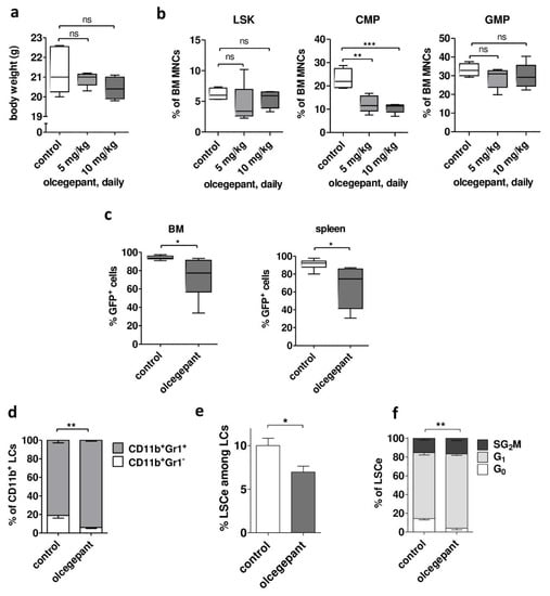 To begin to explore the possible utility of small-molecule CGRP antagonists for the treatment of AML, a mouse model was used in which AML is driven by MLL-AF9 (MA9), a leukemogenic fusion gene recurrently found in human AML [,,]. This model is one of the best characterized AML models, and one of the very few for which an immuno-phenotype characterizing a strongly LSC-enriched cell population (LSCe) has been described (Lin− Sca1− c-Kit+ CD34+ CD16/CD32hi [,]). Calcrl and Ramp1 were expressed both in BM from healthy C57BL/6 mice and in leukemic cells (LCLSK_MA9) from mice that had developed AML after transplantation with MA9-transduced LSK cells (Figure S4a). Olcegepant was developed for the treatment of migraines and exhibited a favorable toxicity profile in humans []. However, data for its maximal tolerability in the C57BL/6 strain and its administration via the i.p. route were not available in the literature. Therefore, healthy C57BL/6 mice were sub-lethally irradiated (5 Gy; to match the conditions employed in the AML model) and, starting on the next day, treated daily with 5 or 10 mg/kg olcegepant i.p. for two weeks. Mice were sacrificed at the end of the treatment period. Neither dose of olcegepant had a significant effect on total body weight (Figure 7a), liver or spleen weight (Figure S4b), white blood cell count (WBC), red blood cell count (RBC), or platelet counts (Figure S4c), or on the relative abundance of LSK cells or granulocyte macrophage progenitors (GMPs) in BM (Figure 7b). To contrast, olcegepant significantly reduced the proportion of common myeloid progenitors (CMPs) in BM (Figure 7b), confirming that hematopoietic cells in BM were exposed, and responsive, to CGRP. Nevertheless, the absence of an effect of olcegepant on all other measured parameters, including on the strongly hematopoietic stem cell enriched LSK population, suggested that its toxicity may be tolerable. Therefore, the impact of in vivo treatment with olcegepant on the emergence and properties of MA9-driven AML were investigated. C57BL/6 mice were sub-lethally irradiated (5 Gy) and transplanted with LCLSK_MA9. Starting on day 7 after transplantation, mice were treated with 10 mg/kg olcegepant or an equivalent amount of vehicle by daily i.p. injection for up to 12 days. Due to rapid disease progression, all mice were sacrificed between day 8 and 12 of treatment, and hematopoietic organs were collected and analyzed. Olcegepant had no effect on spleen weight, WBC, RBC, or platelet counts (Figure S4d,e). However, it significantly decreased the proportion of leukemic (Venus+) cells in BM and spleen (Figure 7c) and increased the proportion of the more mature Gr1+ cells among myeloid leukemic (CD11b+ Venus+) cells (Figure 7d, Figure S4f). Most importantly, olcegepant diminished LSC properties: it reduced both the abundance of LSCe and one of their key properties, namely, proliferative quiescence (Figure 7e,f, Figure S4g,h).