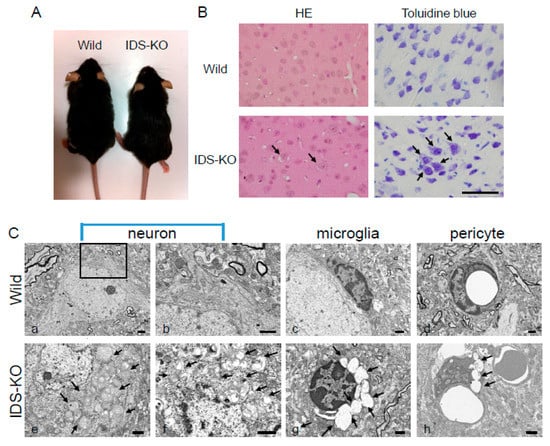The appearance of wild-type and iduronic acid-2-sulfatase (IDS)-knockout (KO) mice. (A) The appearance of IDS-KO mice was not markedly changed. (B) Hematoxylin and eosin (HE) and toluidine blue (TB) staining of cerebral cortex from six-month-old mice. The neurons of the IDS-KO mice contained numerous vacuoles (arrows). Bar = 100 μm. (C) Electron micrographs of the cerebral cortex of wild-type (a–d) and IDS-KO (e–h) mice: (a,b,e,f) show neurons; (c,g) show microglia; (d,h) show pericytes. Panel b shows a higher magnification of the boxed area in (a). Numerous spiral structures and layered structures (e) and autophagy-like vacuoles (f) were found in the cytoplasm of the neurons in IDS-KO mice, and numerous vacuoles were observed in the cytoplasm of the microglia (g) and pericytes (h). Arrows indicate vacuoles. Bar = 1 μm.