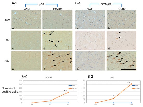 Immunostaining of P62 and subunit c of mitochondrial ATP synthetase (SCMAS) in the cerebral cortex. Immunostaining of P62 (A-1) and SCMAS (B-1) of specimens from wild-type (a,c,e) and IDS-KO (b,d,f) mice. Eight-week-old (8W) mice (a,b), three-month-old (3M) mice (c,d), nine-month-old (9M) mice (e,f). Arrows in A-1 and B-1 indicate p62-immunopositive cells and SCMAS-immunopositive neurons, respectively. Changes in the number of p62-positive cells (A-2) and SCMAS-positive cells (B-2) within 0.3 mm2 of cortex over time. Bar = 100 μm. * p < 0.05, ** p < 0.01, Welch’s t-test.