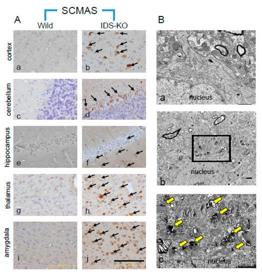 (A) Localization of SCMAS in the central nervous system (CNS) of wild-type and IDS-KO mice. No immunopositive cells were found in wild-type mice (a,c,e,g,i). In IDS-KO mice (b,d,f,h,j), immunopositive cells (arrows) were present in the cortex (b), cerebellum (d) hippocampus (f), thalamus (h), and amygdala (j). Bar = 100 μm. (B) SCMAS immunoelectron microscopy of the cerebral cortical neurons of wild-type (a) and IDS-KO mice (b,c). The immune response was negative in the wild-type mouse (a). SCMAS immunopositivity was observed at the vacuoles with single membranes (arrows) and in mitochondria that were partially swollen (b). Immunopositive reactions were observed in layered finger-print-like arrays and multilayered array structures ((c), arrows). Panel c shows the magnified view of an area indicated by a black rectangle in Panel b. Bar = 1 μm.